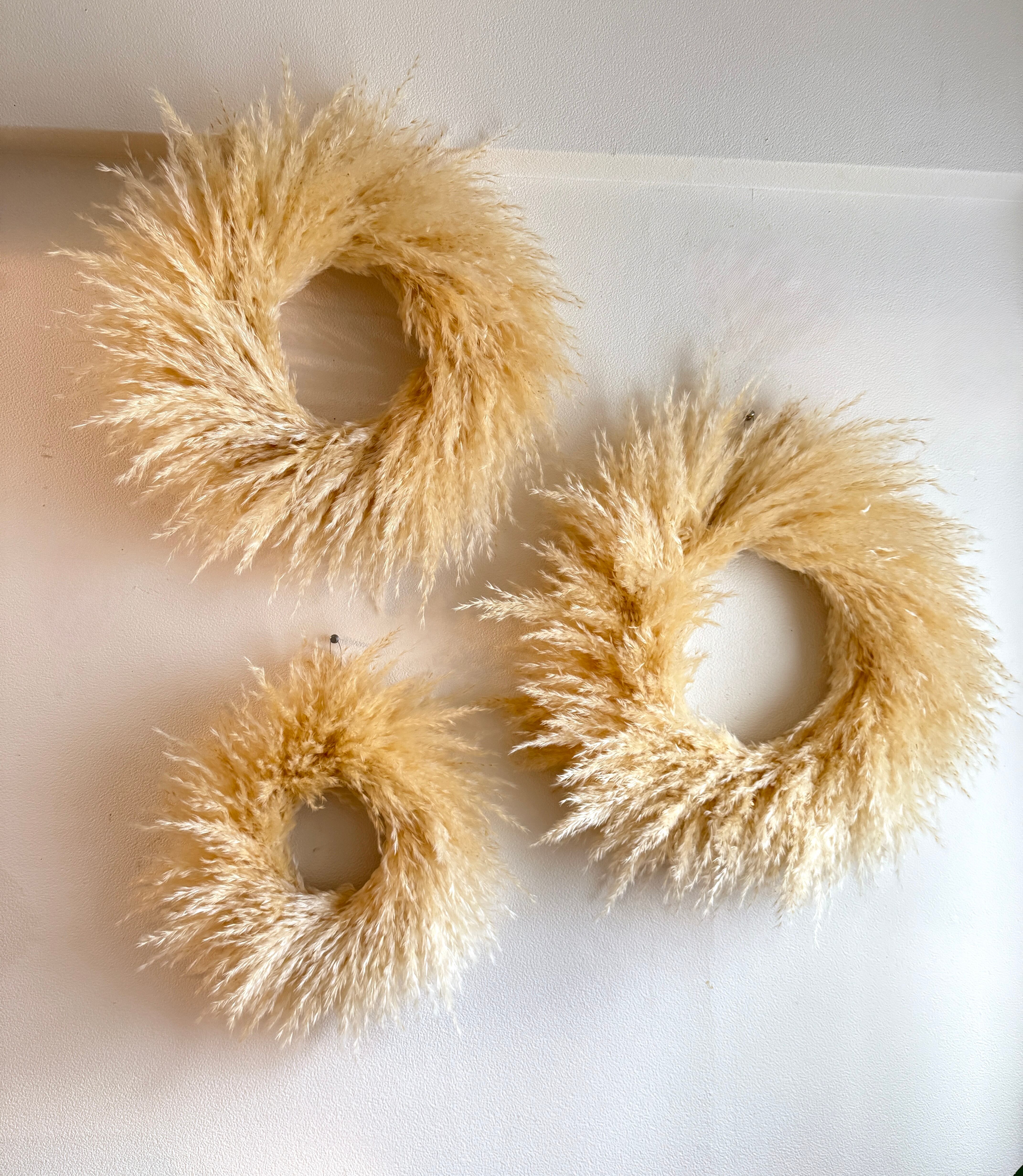 全長140cmほど、穂の長さ80cmほどの特大サイズの綺麗なパンパスグラスのみを使用したリースを作りました。