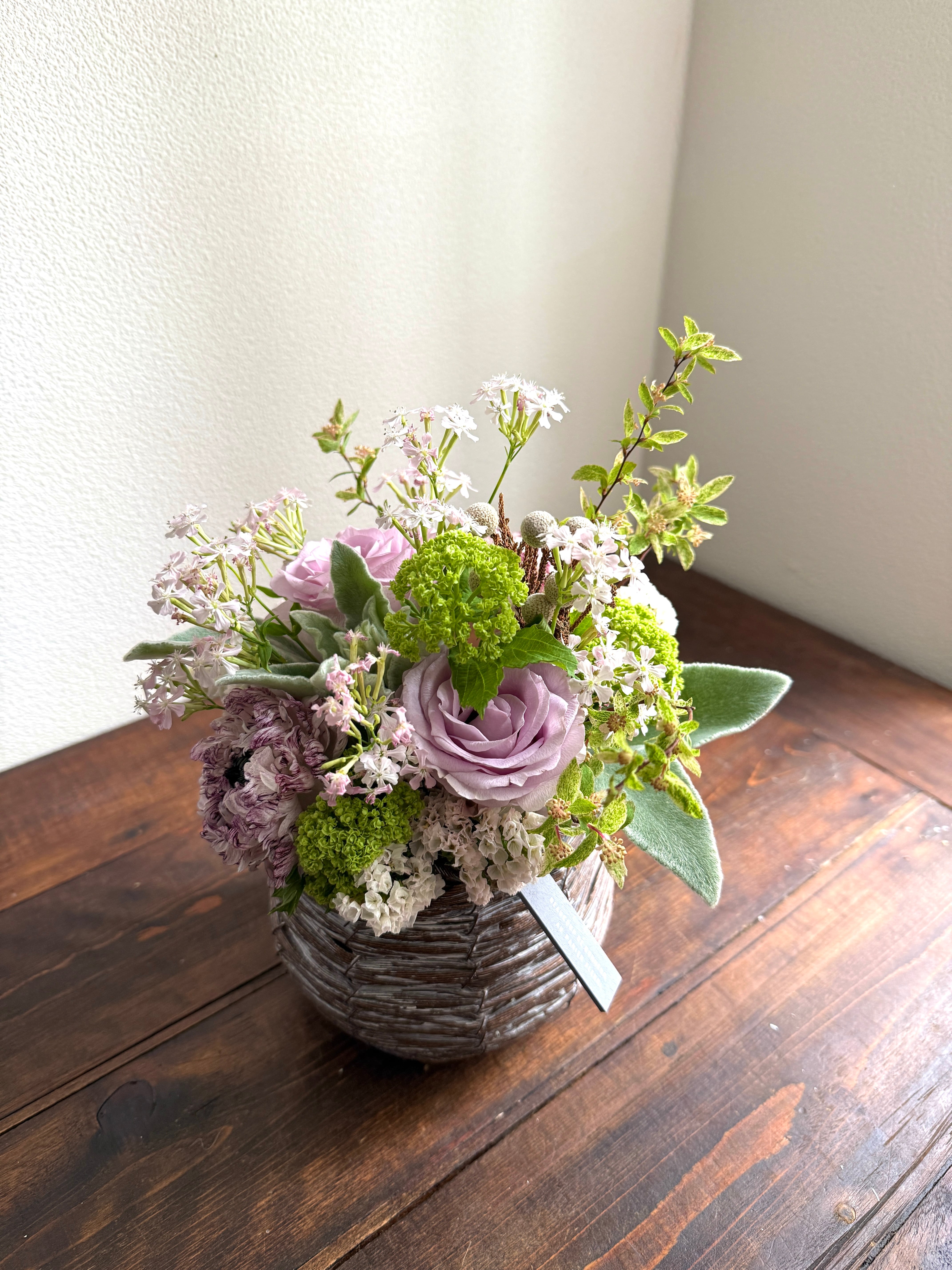 TENセレクトの特徴は、店舗を持たないアトリエ形式の花屋のため、オーダー以外のお花の在庫を持ちません。その為、直前の仕入れの新鮮なお花で、その時々の季節感を取り入れ制作しております。